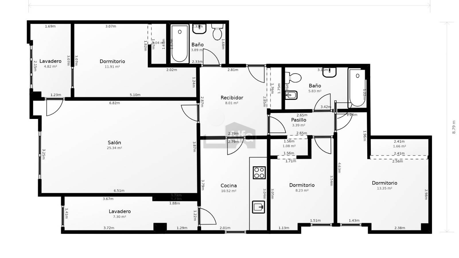 La vivienda cuenta con 3 dormitorios, 2 baños completos, y una distribución muy funcional. Destacan sus dos terrazas: una con salida directa desde el salón y otra en la cocina.